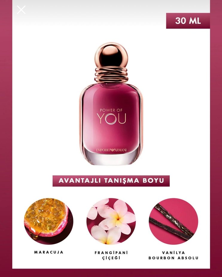 Emporio Armani Power Of You EDP 30 ml kadın parfümü, şık ve kalıcı koku sunar. Trendyolda orijinal satıcısından aldım bir fıs sıktım ben sevmediğim için satıyorum.