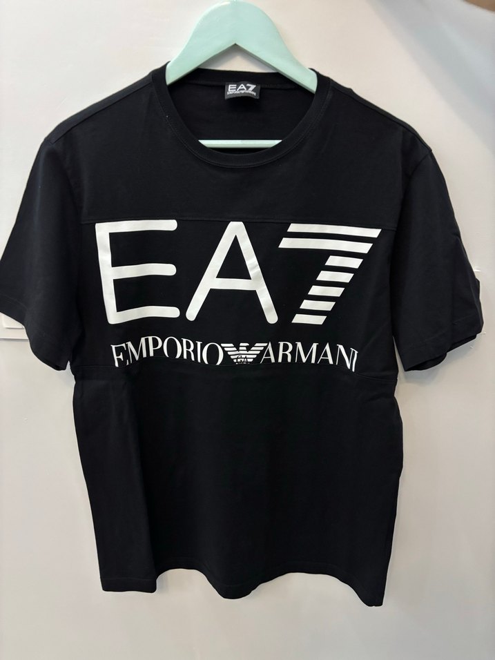 Emporio Armani siyah pamuk erkek tişört, bol kesim, kısa kollu ve yuvarlak yakalı. Büyük baskılı logo detayıyla rahat sokak stili için uygun.