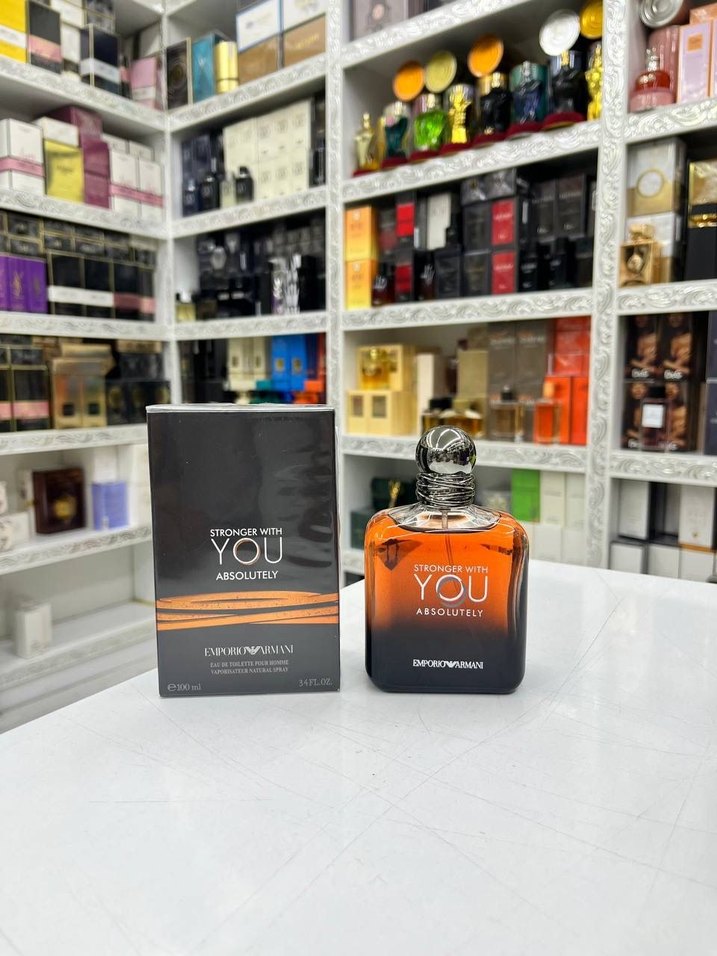 Emporio Armani Stronger With You Absolutely erkek parfümü, minimalist kahverengi ve gri tasarıma sahiptir. Şişe ve kutuda "YOU ABSOLUTELY" yazısı bulunur. ️