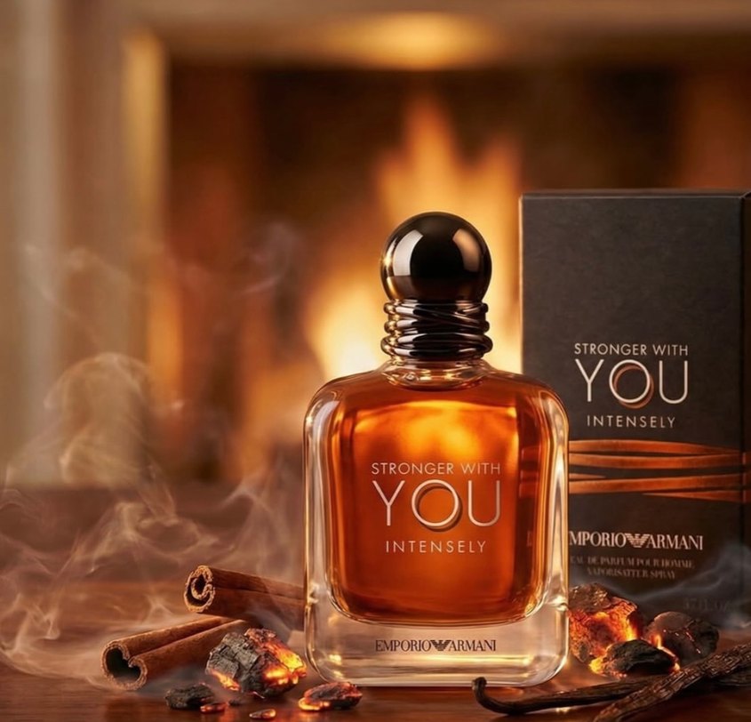 Emporio Armani Stronger With You Intense, parlak bej şişede klasik tarzda, yoğun ve sıcak kokulu erkek parfümü.