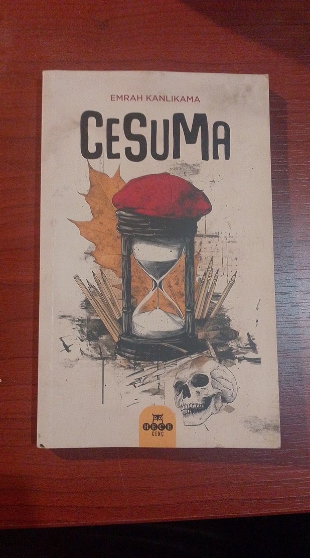 Emrah Kanlıkama'nın 'Cesuma' romanı, zaman ve ölüm temalarını çağrıştıran kum saati, kırmızı bere, kafatası ve sonbahar yaprağı görselleriyle dikkat çekiyor.