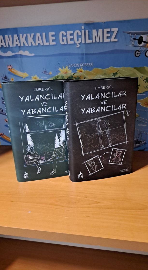 Emre Gül'ün "Yalancılar ve Yabancılar" adlı romanının iki ciltlik seti, koyu renk kapaklarda minimalist çizimlerle.