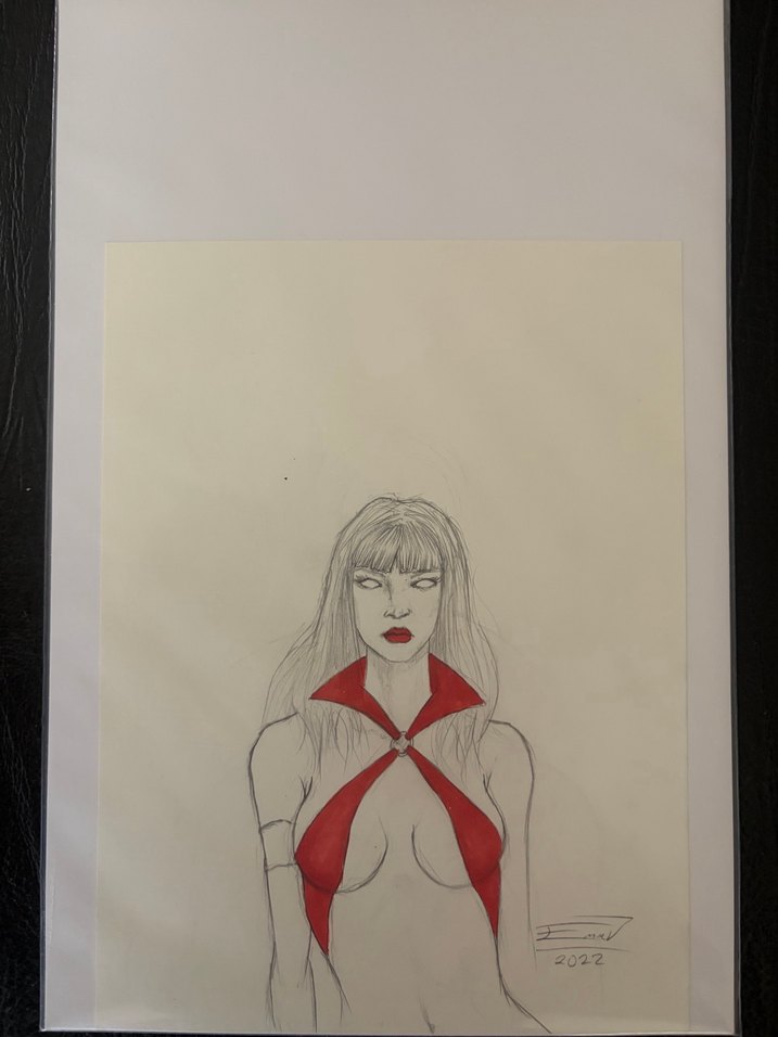Emre Varlıbaş tarafından 2022 tarihinde çizilmiş Vampirella çizimidir. A4 kağıdından daha küçük bir kağıda çizilmiştir. İmzalı ve fotoğraflarda görüldüğü gibidir.