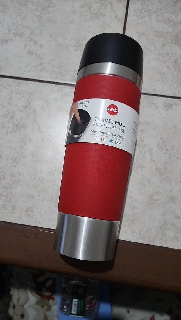 Emsa marka kırmızı ve gri seyahat termosu, sızdırmaz kapak ve içecekleri 6 saat sıcak ya da 12 saat soğuk tutma özelliğine sahiptir.