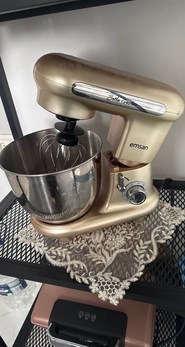 Emsan markalı, parlak altın renkli mutfak mikseri, metal karıştırma kabı ve ayarlanabilir hız seçeneklerine sahiptir.