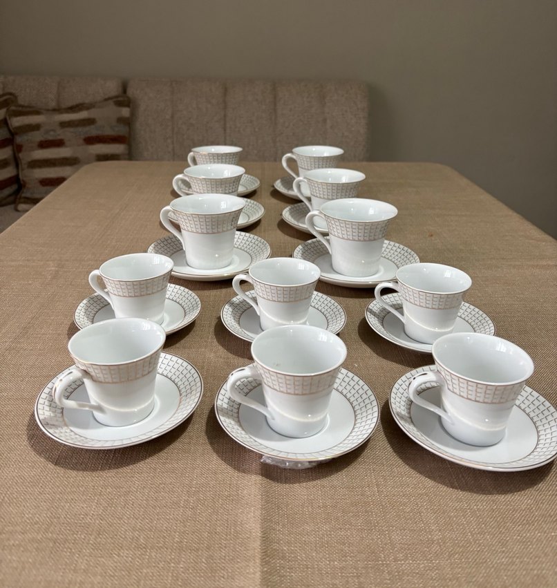 Gri desenli beyaz 6 parça kahve fincanı takımı, 6 parça çay fincanı takımı her biri uyumlu bir tabağa sahip. Fincanlar hafif genişleyen yapıda ve kullanışlı kulplu. ☕