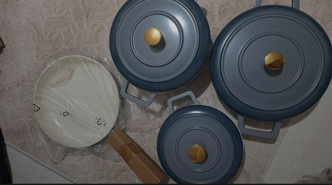 Altın renkli kulplara ve kare saplara sahip. Modern ve şık bir görünümü var. içi seramik dışı döküm. hafif ve kullanışlı bir model. sıfır hiç kullanılmadı. Hediye geldiği ve ihtiyacım olmadığı mutfakta da yer olmadığı için satmak durumundayım. Sıfırı şuanda 8700 tl. 7 parçadır.
