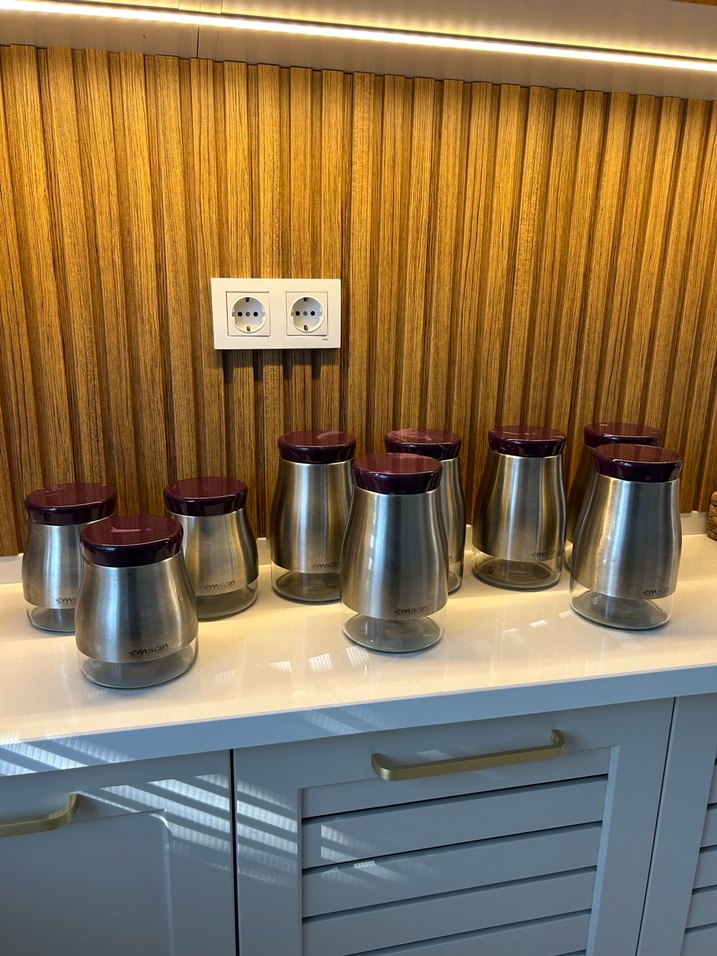 Bordo kapaklı gri metal mutfak saklama kavanozları, mutfak eşyalarını düzenlemek için kullanışlıdır. Dayanıklı ve şık tasarım.kapaklarda lekeler mevcuttur