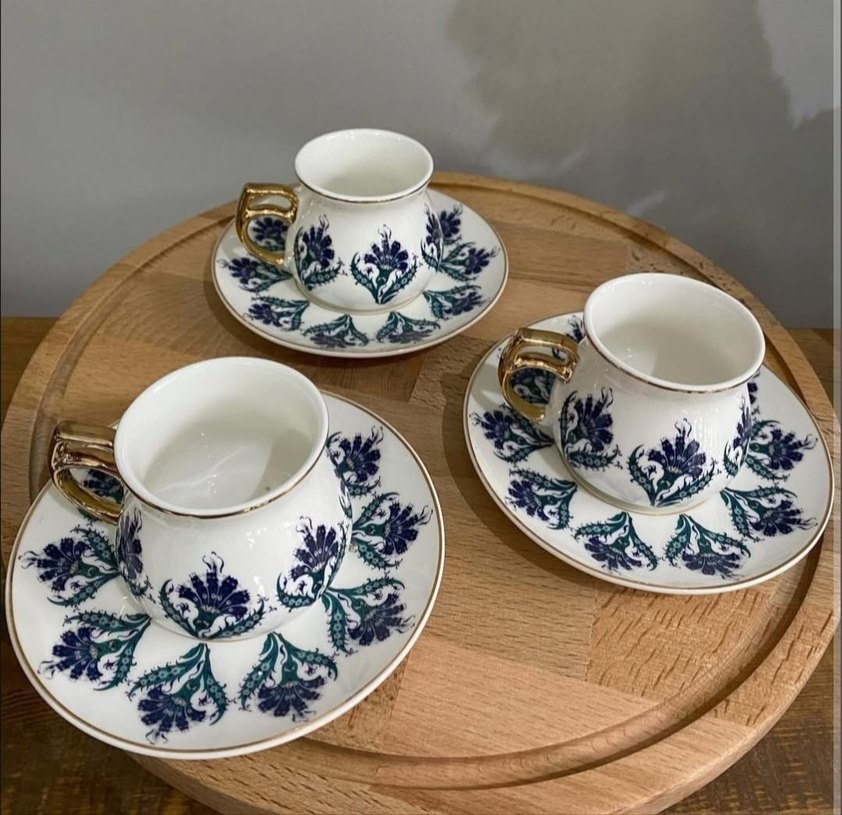Altın detaylı kulplara ve koyu mavi çiçek desenlerine sahip porselen fincan takımı. Her fincan uyumlu bir tabak ile birlikte sunulur. ☕