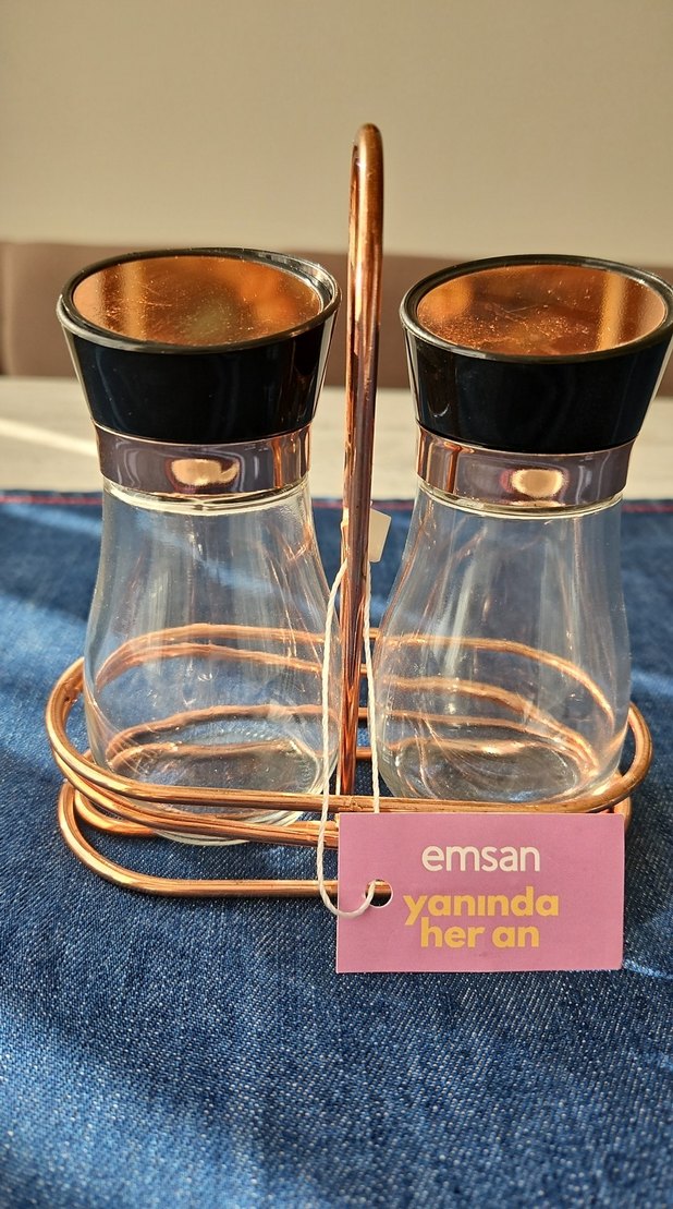 İki cam baharatlık, koyu altın kapaklı ve altın renkli tutucuda. Emsan markalı, 'yanında her an' etiketiyle.