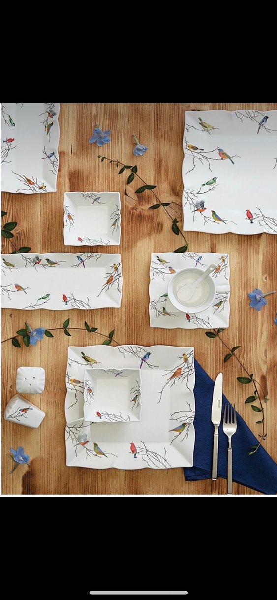 Çeyiz için, Beyaz porselen yemek takımı, kuş ve dal desenleriyle, uygun fiyatlı,kare ve dikdörtgen şekillerde çeşitli servis seçenekleri sunar.
