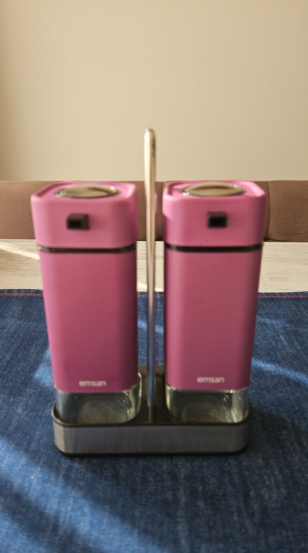 Emsan markalı, paslanmaz çelik standlı, pembe renkli iki baharatlık seti. Mutfakta düzen için uygundur.