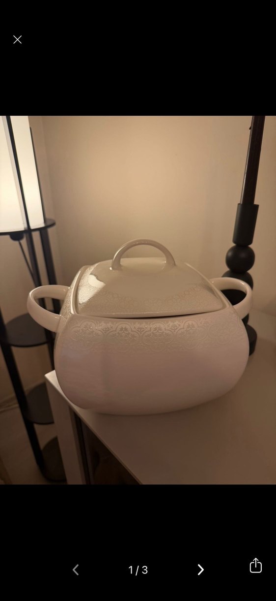Kapaklı ve kulplu beyaz porselen tencere, zarif desenlere sahip. Sunum ve pişirme için uygundur.