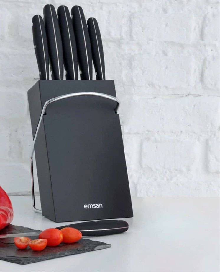 Emsan Mia 6 Parça Bıçak Seti Siyah Hep keskin, çok keskin... 6 parçadan oluşan yeni Mia bıçak seti şık bir tasarıma sahiptir. Bilenmesi gerekmeden keskinliğini uzun süre korur. Tezgahınızda yer kaplamayan şık tasarımlı ahşap bıçak bloğu ile birarada sunulmaktadır. Bulaşık makinesinde yıkamaya uygundur. Uzun ömürlü kullanım için yıkandıktan sonra hemen kurulayınız. Set İçeriği 9 cm Soyma Bıçağı 12 cm Sıyırma Bıçağı 20 cm Doğrama Bıçağı 20 cm Ekmek Bıçağı 20 cm Şef Bıçağı 13 cm genişlikte Stand