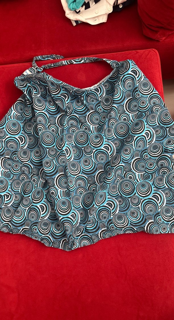 mavi ve siyah dairesel desenlere sahip renkli bir emzirme önlüğü.