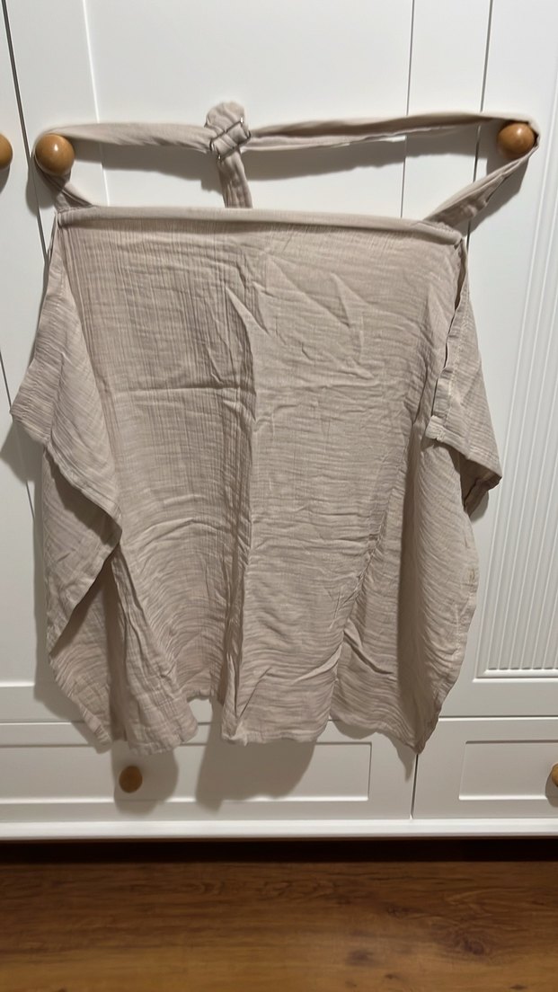 Bej renkli, askılı, midi boyda, kısa kollu ve bol kesim emzirme önlüğü. Rahat kullanım sağlar.