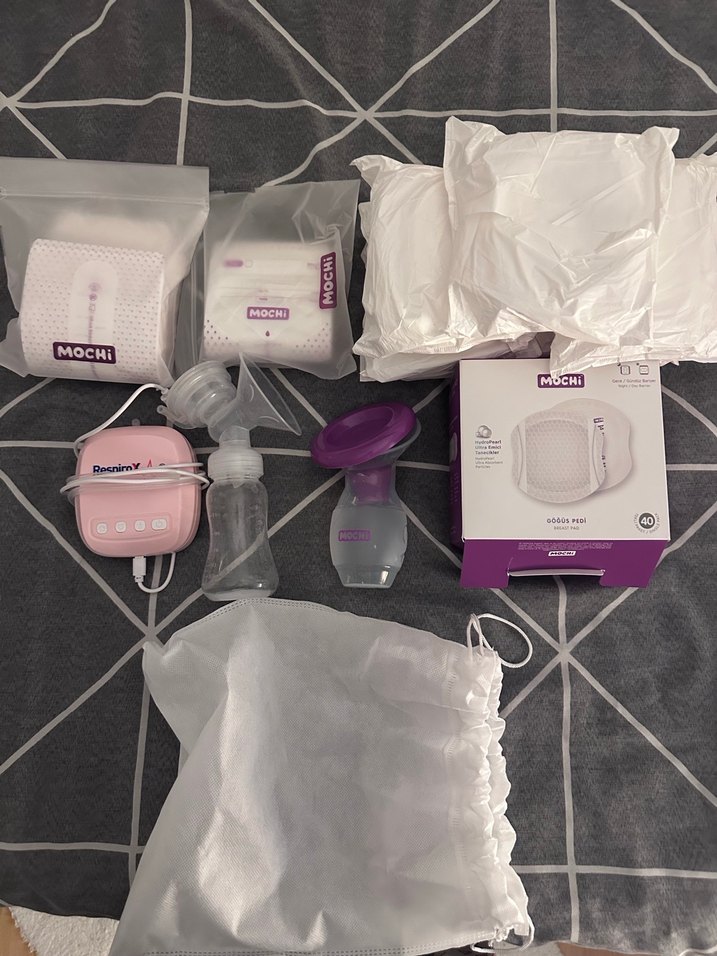 MOCHI göğüs pedi 40lı MOCHI süt saklama poşeti 2 paket bir tanesi yarım MOCHI manuel süt sağma pompası Bir adet elektrikli Respiro süt sağma makinesi Yedi adet hediye lohusa pedi Toplam fiyatıdır