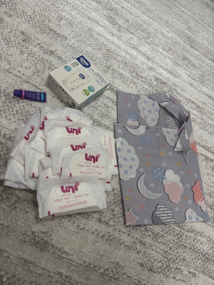 Emzirme önlüğü Lansinoh göğüs ucu kremi (bir iki kez kullanıldı sadece) 20 adet süt saklama poşeti 30 adet unıbaby göğüs pedi