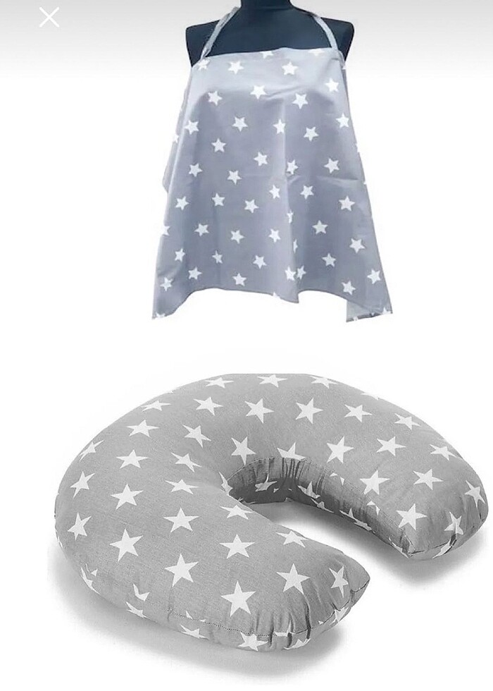 Yastık, yedek kılıf ve emzirme önlüğü. Yedek kılıfın fermuarı bozuk.