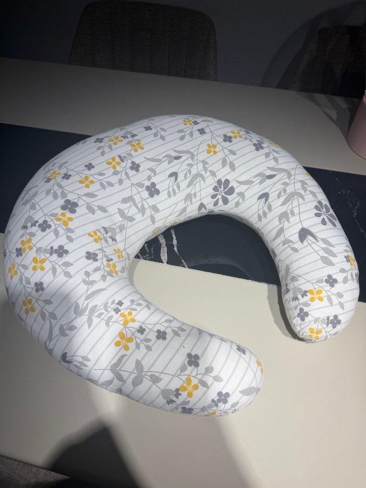 Gri zemin üzerine sarı ve gri tonlarda çiçek desenli emzirme ve hamile yastığı, rahatlık ve destek sunar.