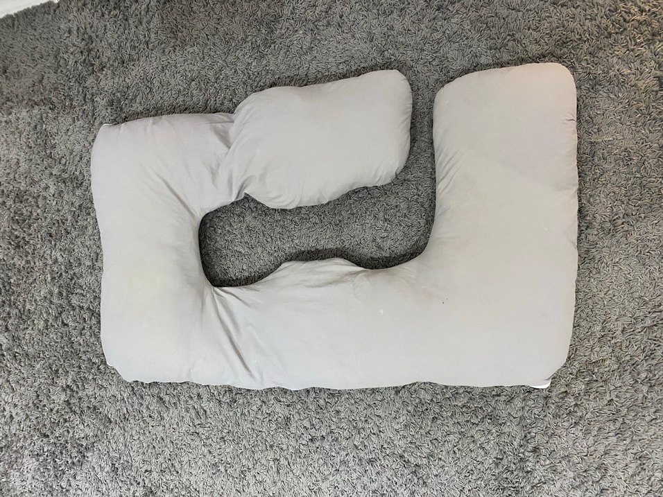 Açık gri renkli, hamilelik ve emzirme için destek sağlayan yumuşak ve rahat yastık.