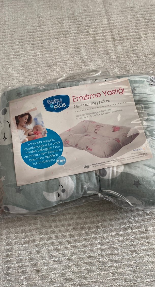Pastel turkuaz renkli, desenli mini emzirme yastığı, anne ve bebek için rahatlık sağlar. Yumuşak ve taşınması pratik. Sıfır