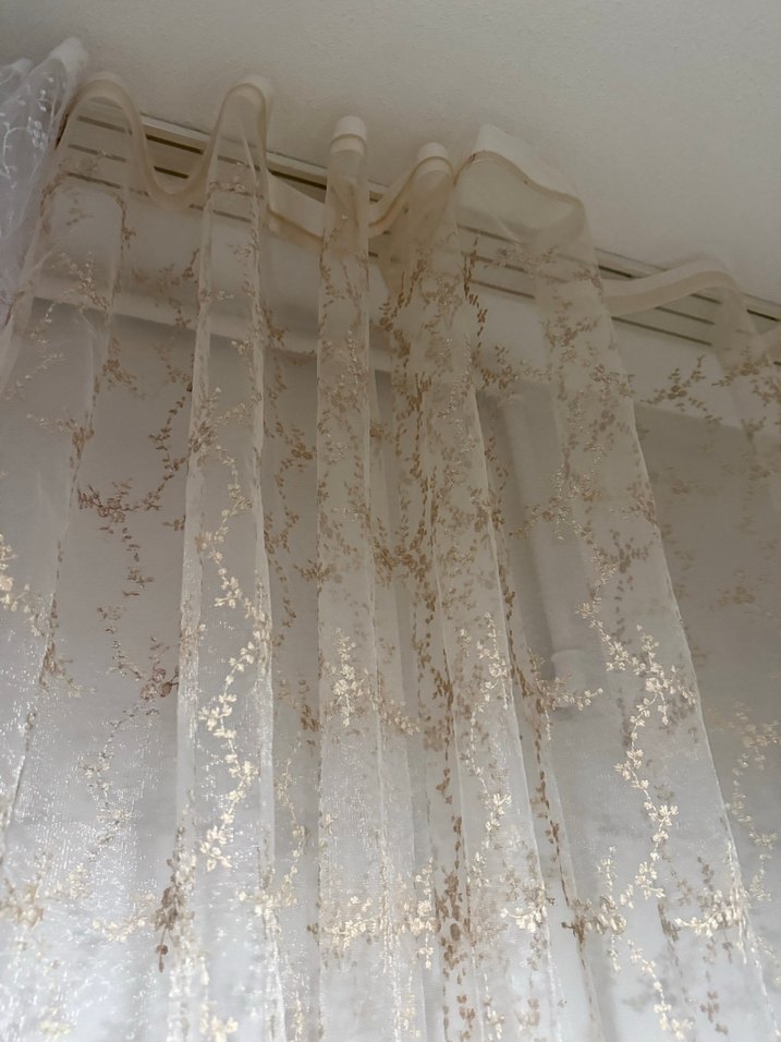 İnce ve hafif krem tül perdede işlemeli bohem desenler yer alır. Doğal ışık geçirirken zarif bir görünüm sunar.