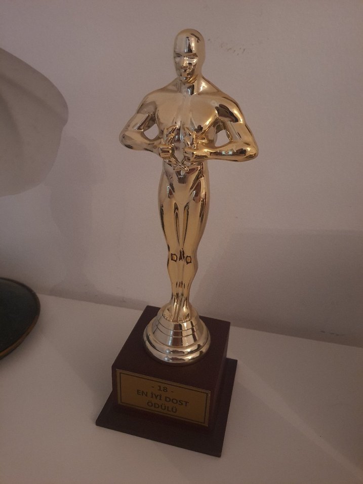 Parlak altın renginde, ahşap kaideli ve plaketli insan figürlü ödül.