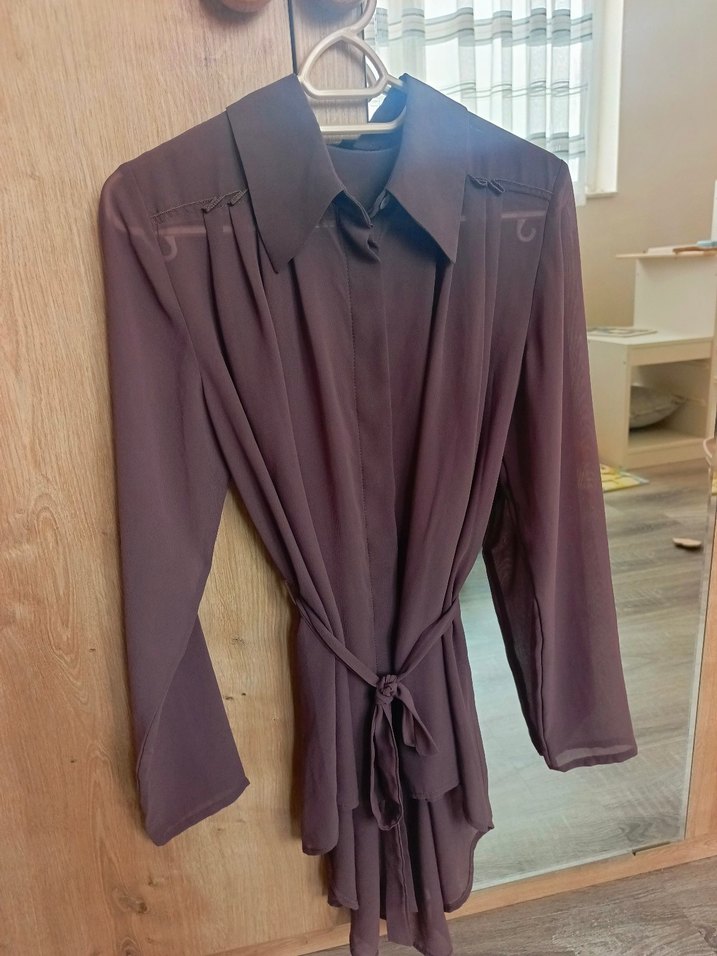 Kahverengi, arkası uzun şifon bir gömlek. Büzgü detayları ile çok şık duruyor giyildiğinde. 1-2 defa kullanıldı.