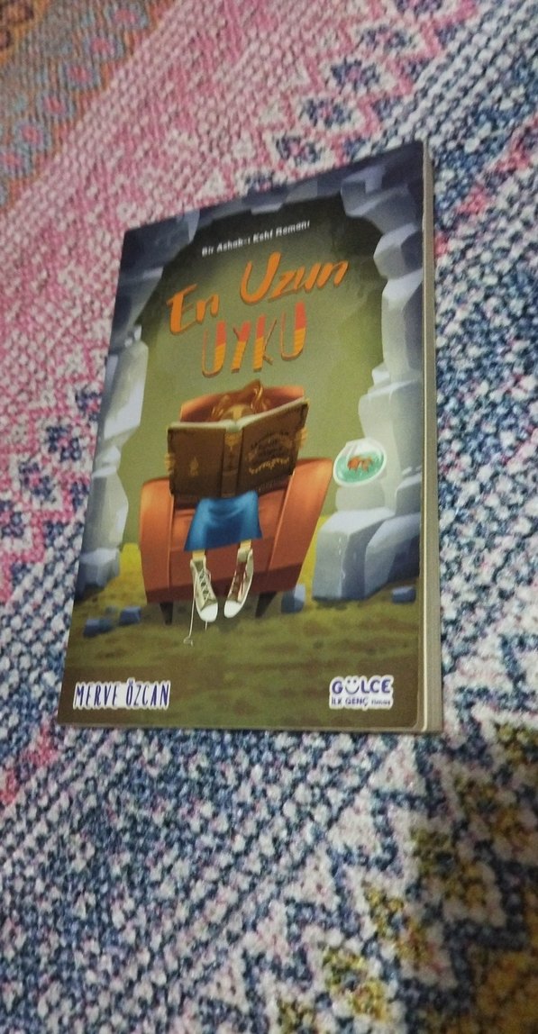 Merve Özcan'ın yazdığı "En Uzun Uyku" adlı hikaye kitabı. Kapakta, koltukta oturup kitap okuyan bir kişi çizimi yer alıyor. temiz kullanılmıştır.