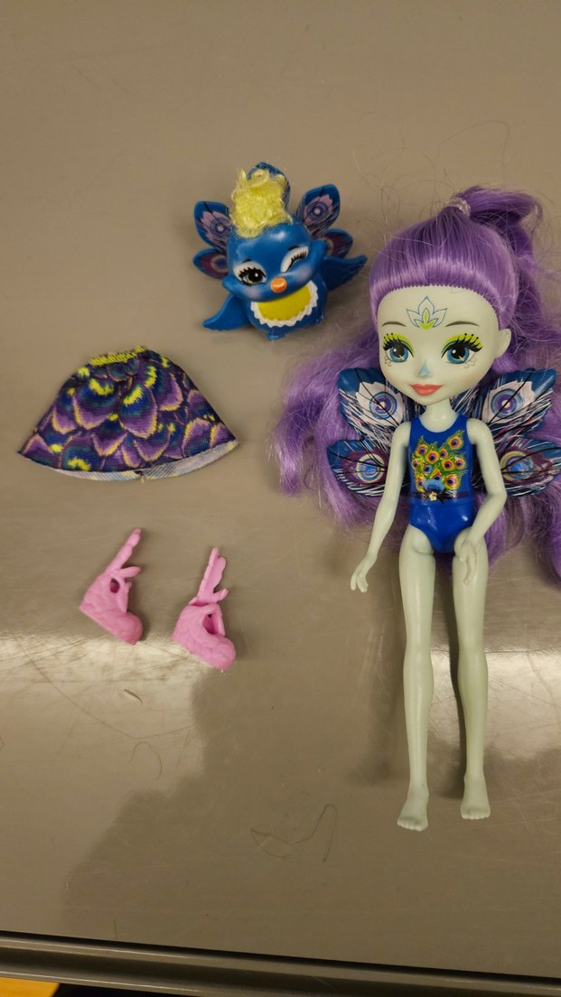 Mor saçlı, kanatlı renkli bir bebek, mavi küçük kuş figürü, desenli etek ve pembe ayakkabılarla birlikte.