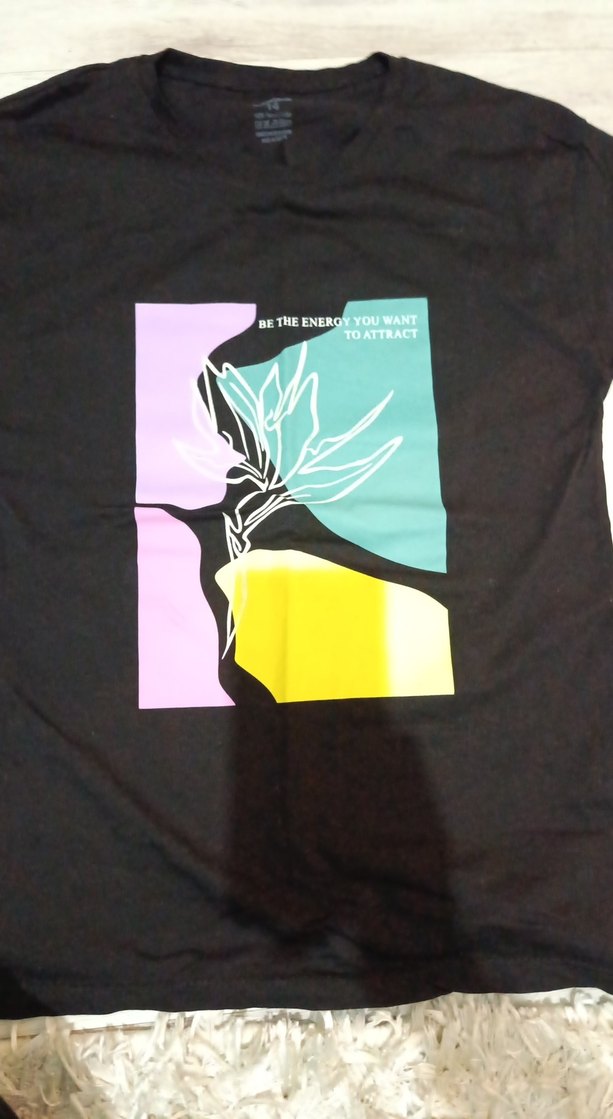 'Çekmek istediğin enerji ol' yazılı, pastel renklerle soyut bir tasarım yer alıyor. kız çocuk kısa kol
