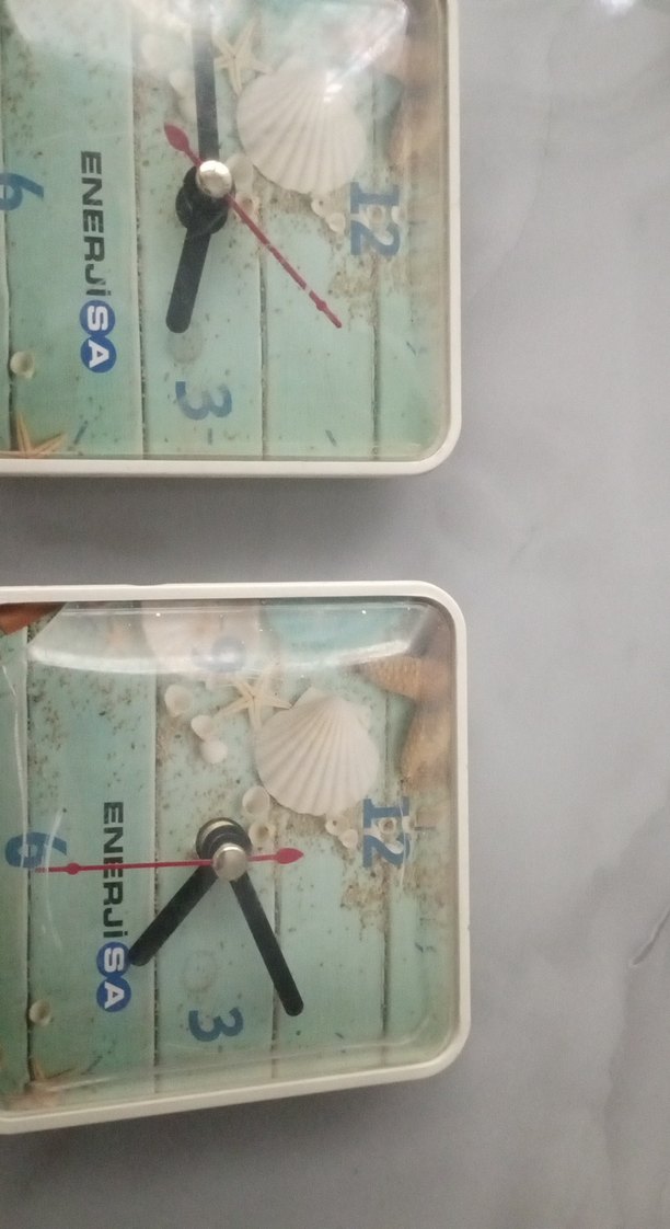 Enerjisa logosu bulunan beyaz masa saati, deniz temalı kabuk ve kum detaylarına sahiptir. Siyah akrep yelkovan ve kırmızı saniye kolu bulunur. ⏰birinin camı kırık ama calismasına engel yok