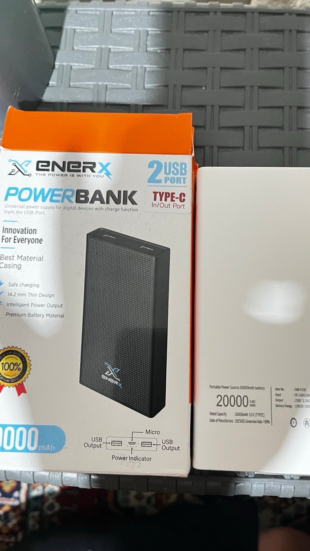 Enerx powerbank, 20000mAh kapasite, 2 USB port ve Type-C giriş/çıkış ile dayanıklı kasa ve güç göstergesine sahiptir.