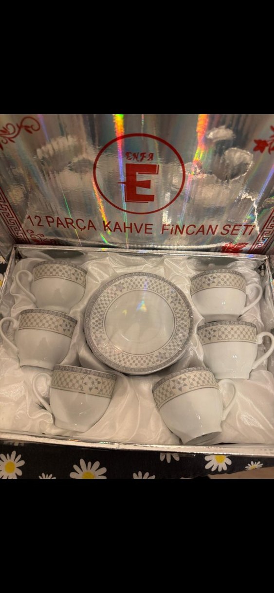 Gri desenli beyaz kahve fincanları ve tabaklardan oluşan 12 parçalık kahve fincan seti. ☕