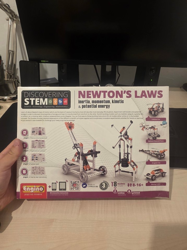 Engino STEM seti, Newton'un yasalarını, eylemsizlik, momentum, kinetik ve potansiyel enerjiyi 18 parçalı modellerle keşfetmenizi sağlar. 8-16+ yaş uygundur. Ürün yurtdışından alınmıştır. 1 Kez kurulup kutusuna kaldırılmıştır. Eksik bir parçası yoktur. Tüm kutu içeriği tamdır. Kurulum ve kullanımı kendi sitesinde videolarla gösterilmektedir.