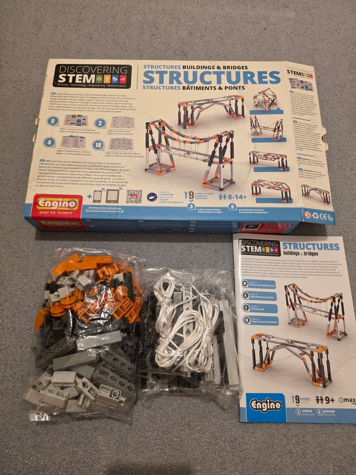 Engino STEM Yapı ve Köprü seti, köprü ve yapılar inşa etmek için çeşitli gri ve turuncu parçalar içerir. 8 yaş ve üzeri için uygundur. Ürün yurtdışından alınmıştır. Kutu içeriği tamdır. Kurulduktan sonra kitapçığı ile yeniden kutulanmıştır. Engino nun kendi sitesinde halen satışta olan modeldir. Kurulum ve kullanım videoları mevcuttur. İlanlarımda bir başka modeli daha mevcuttur. ️