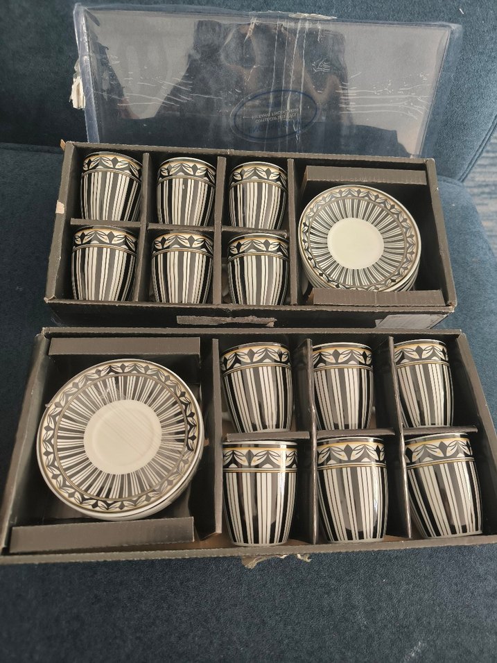 English home çizgili desenli 12 kahve bardak ve tabak seti iki kutuda düzenli şekilde paketlenmiş. ☕