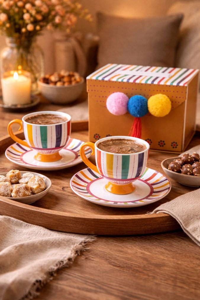 Renkli çizgili seramik kahve fincanları ve tabakları, sıcak içecek servisi için uygundur. Renkli ponponlu dekoratif kutu ile birlikte gelir. ☕