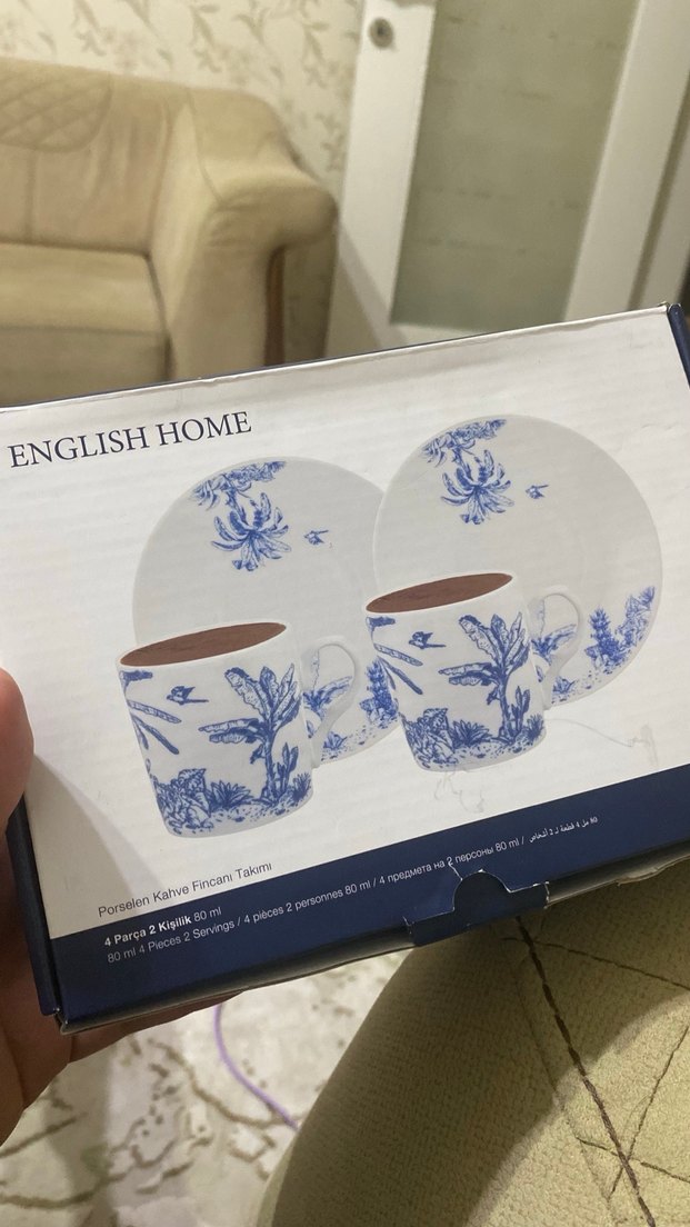 English Home markalı, çiçek desenli, açık mavi porselen 4 parça kahve fincan takımı. Her fincan 80 ml hacmindedir. ☕