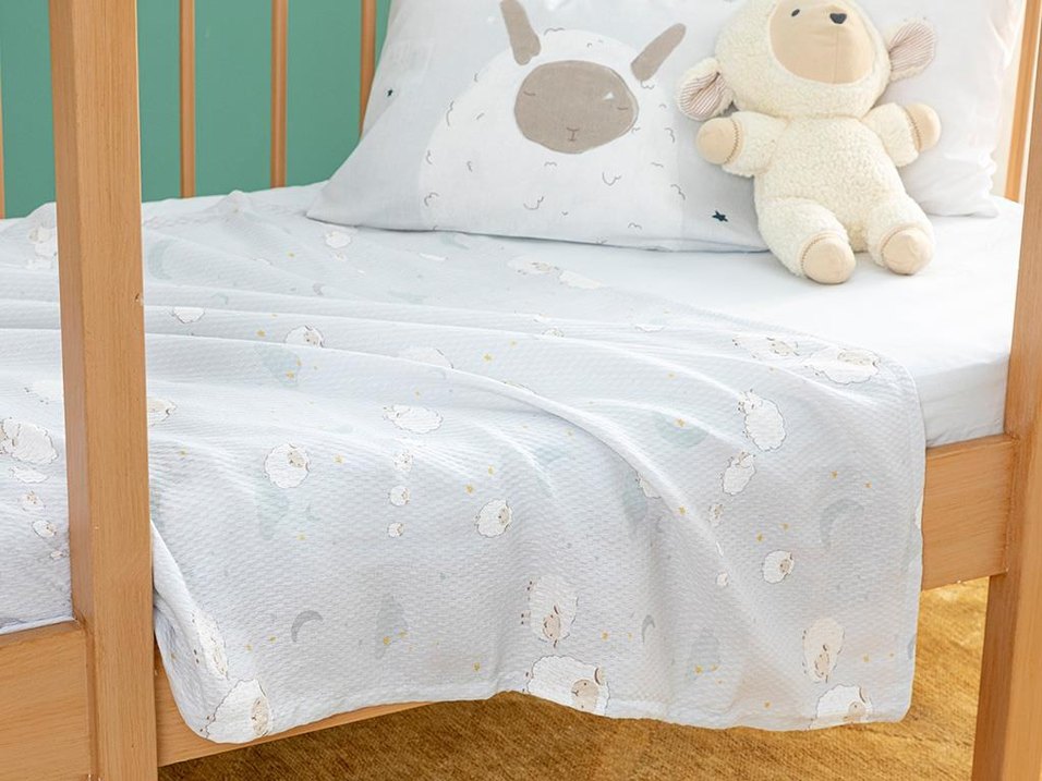 Pamuklu yumuşak kumaş üzerine nakışlı pastel koyun desenleriyle çocuklar için rahat ve nazik dokunuşlu bebek pike. English Home marka.