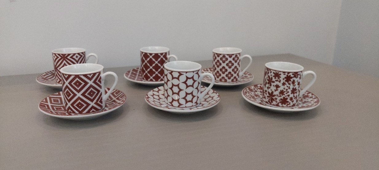 Bordo renkli kahve fincanları ve tabakları farklı geometrik desenlerle süslenmiştir. ☕ Hediye gelmişti alan arkadaşım direkt yerleştirdi o yüzden kutusu bulunmamaktadır. büyük fincanda kahve içmeyi sevdiğim için hiç kullanılmadı ihtiyaç fazlasıdır