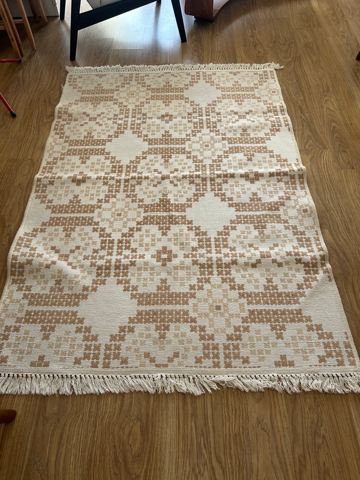 English Home Kilim 120x180 cm İki taraflı kullanılabilir. Saçaklarla beraber eni 180 cm. Ölçüler satıştaki ölçülerdir. Ölçüldüğünde 5-10 cm farklı çıkıyor. Lekesi yıpranması yok. Halı yıkamacıda yıkandı tertemiz. Saçaklar kısa kenarda. Hiç kullanılmadı sayılır. İhtiyaç fazlası olarak baza altında yeni sahibini bekliyor.