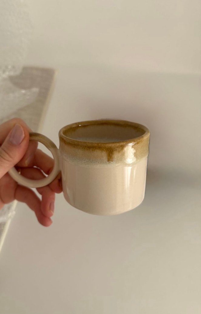 Yumuşak bej pastel tonlarda, parlak seramik kupa. Yuvarlak kulplu ve biraz daha koyu bej renkte geniş bir ağız kısmı bulunur. ☕
