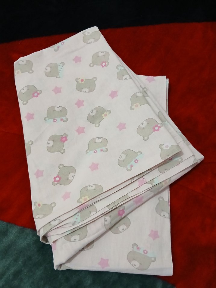 Tek bir parçadır. boy 1.39cm en ise 100cm. Sayılı ve temiz kullanılmıştır. Yumuşak pamuk kumaştan yapılmış, pembe pastel renkte ( solma yoktur ), sevimli ayıcık desenli çocuk nevresim. #nevresim