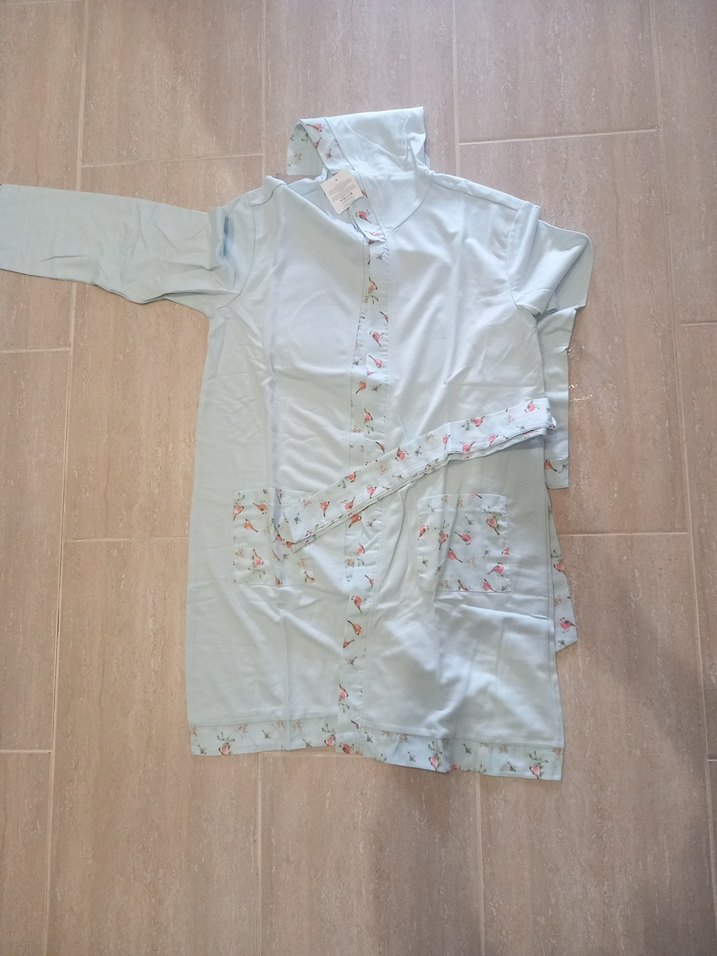 Uzun kollu, yakalı ve bol kesim beyaz emzirme sabahlığıdır. Çiçek desenli kenar detayları, kuşak ve ön cepleri bulunur.