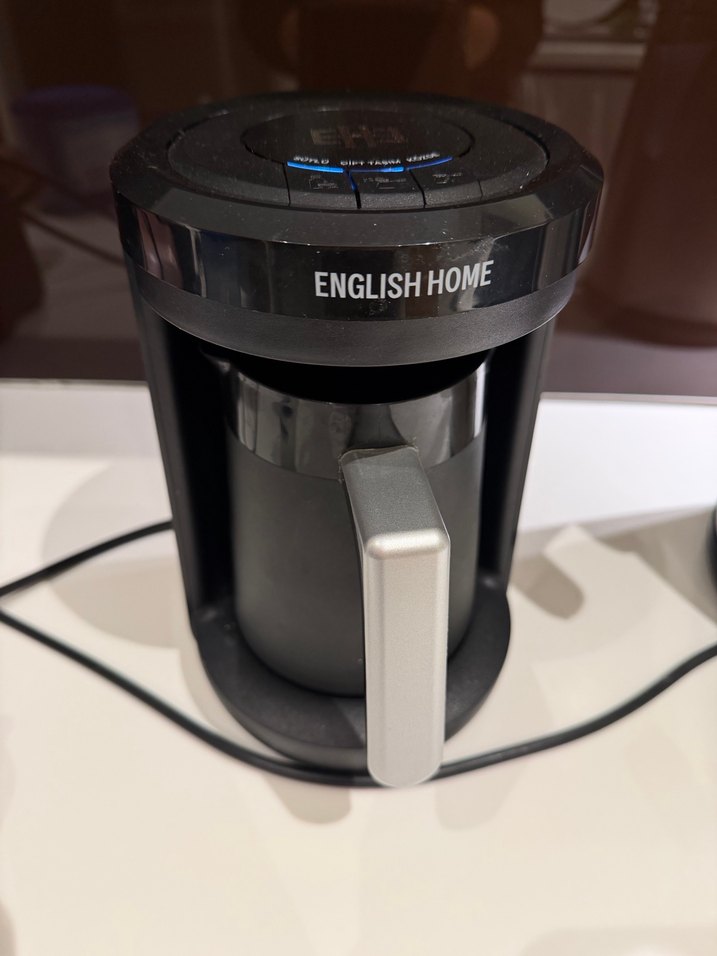 English Home siyah kahve makinesi, gri tutamaçlı ve üstte kolay kullanım düğmeleriyle. Kompakt tasarım, ev kullanımı için uygun. ☕