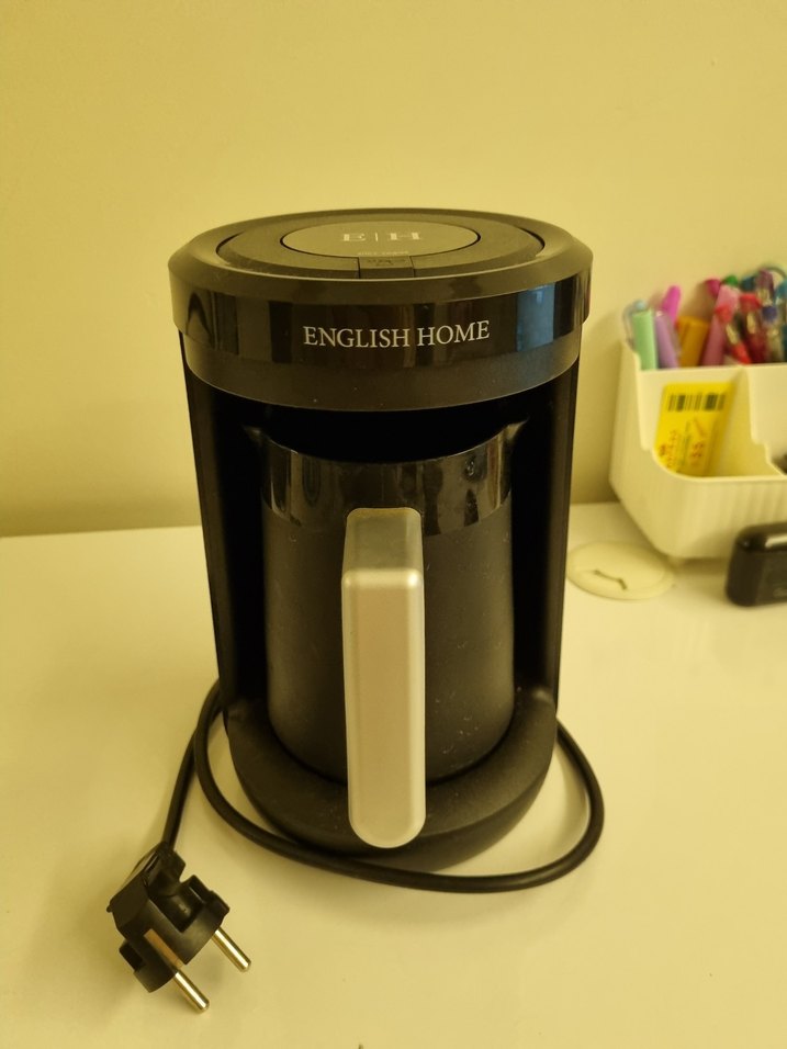 English Home markalı siyah kahve makinesi, gri saplı, kompakt ve kullanımı kolay tasarıma sahiptir. Taze kahve hazırlamak için uygundur. ☕