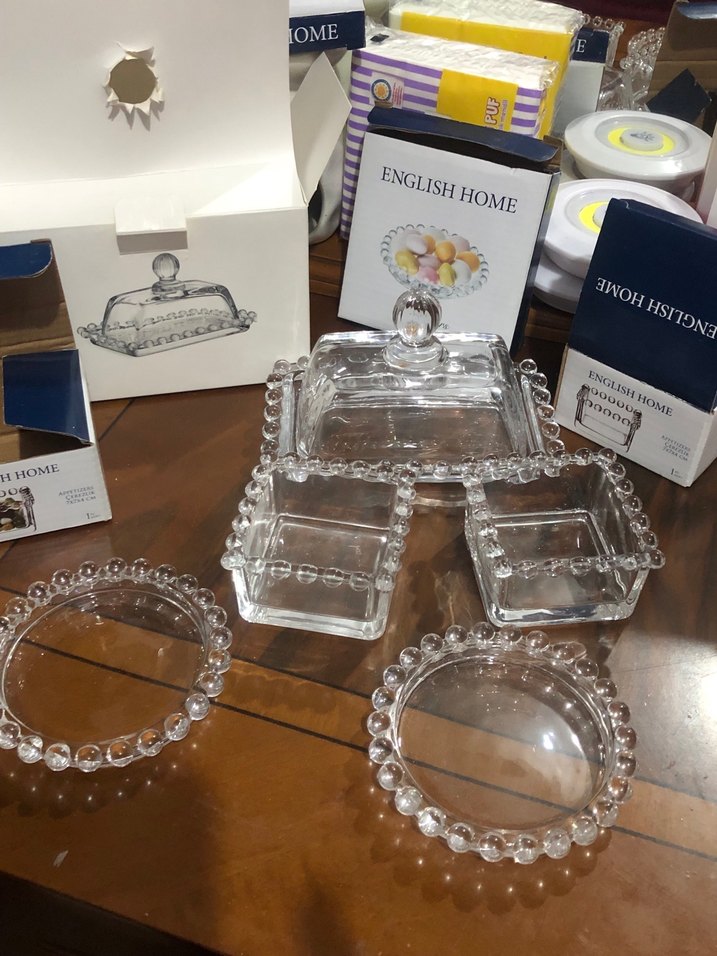 English Home markalı vintage tarzda, beyaz nakışlı detaylara sahip cam tabak ve kapaklı tabak seti. İnce boncuklu kenarlarıyla şık ve zarif görünüme sahiptir. ️