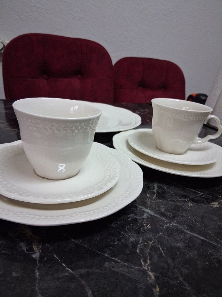 2 fincan, 2 fincan tabağı, 2 tatlı tabağı, 1 servis tabağından oluşmakta. Tabaklar 14-19-27 cm boyutunda. Hiç kullanılmadı fakat bir fincan tabağında küçük bir kırık var, son görselde belirttim. şimdi farkettim fiyata yansıttım. Güncel fiyatlarını görsellere ekledim. 2500₺ lik bir takım, dolaplarımda yer açmak istediğim için satışta.